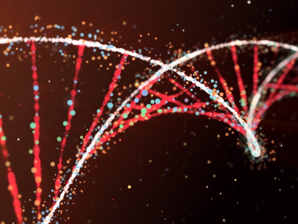 A digital DNA strand, artistically crafted from colorful particles using the Trapcode...