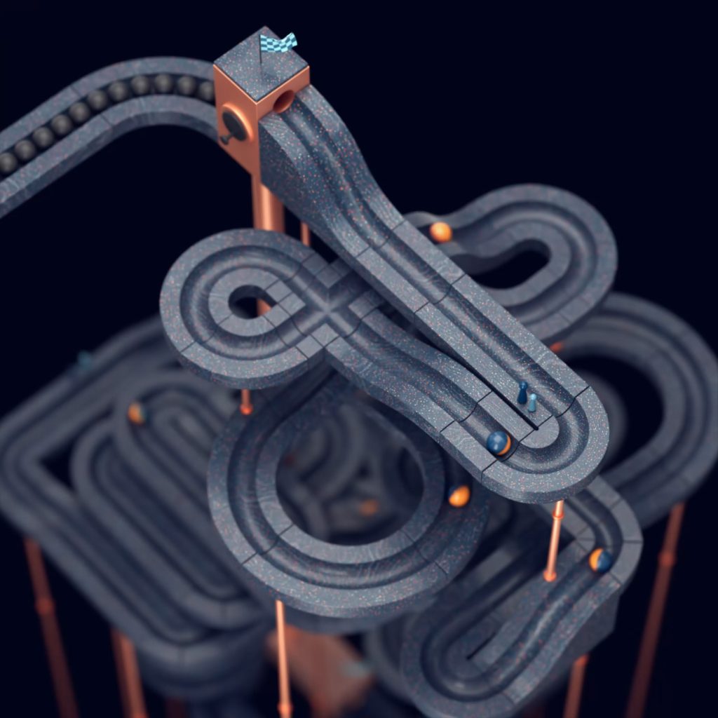 Marbles run along the curves and loops, perfectly synchronized in a delightful...
